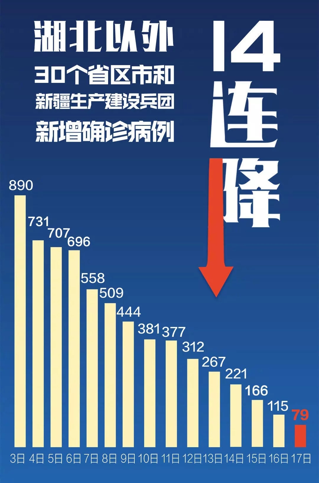 全國除湖北以外地區(qū)新增病例已實(shí)現(xiàn)14連降,從2月3日的890例下降到16日的115例。