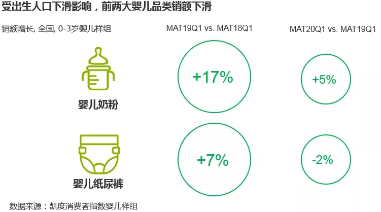 受到新生人口減少的影響,母嬰市場兩大頭部品類——奶粉和紙尿褲增長開始放緩。凱度消費者指數(shù)顯示,2019年一季度嬰兒紙尿褲銷售額同比增長7%,但2020年一季度同比下滑了2%,這一部分下跌與年初的疫情事實上關系不大。多位資深從業(yè)者表示,即便身處動蕩的疫情環(huán)境下,消費者對于奶粉、紙尿褲這樣的剛需產品的投入絲毫不會吝嗇。