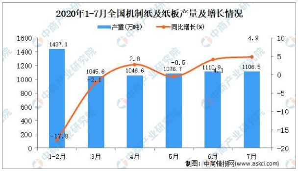 根據(jù)中國輕工業(yè)信息中心數(shù)據(jù)顯示,2020年1-7月,全國機制紙及紙板產(chǎn)量6843.8萬噸,同比下降3.3%。7月當(dāng)月,全國機制紙及紙板產(chǎn)量1106.5萬噸,同比增長4.9%。