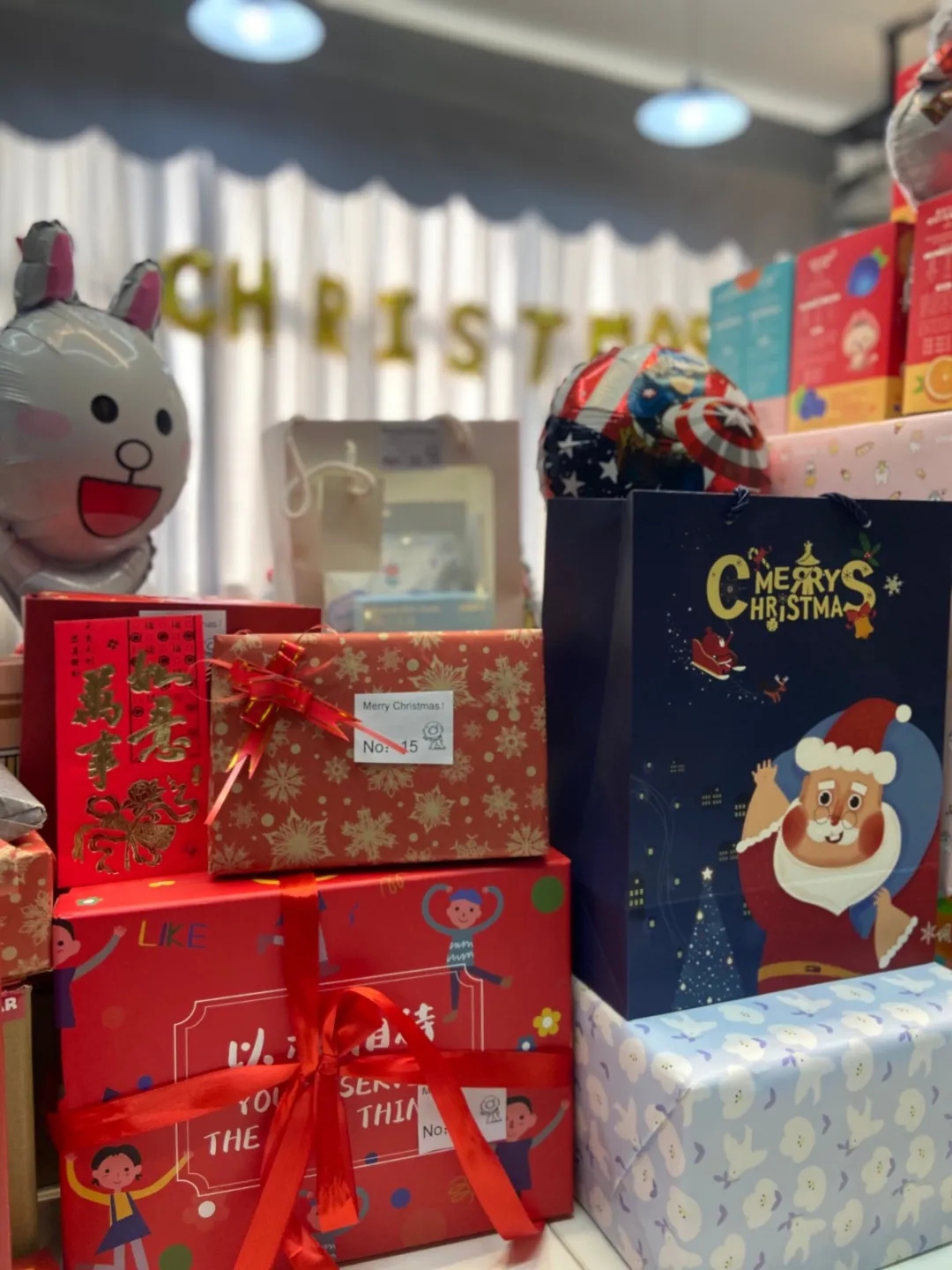 喏,臺上滿滿當當?shù)木?,大的小的,紅的綠的,還有會發(fā)光的,禮應如此!