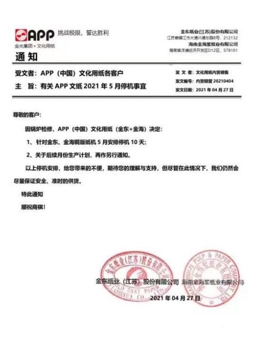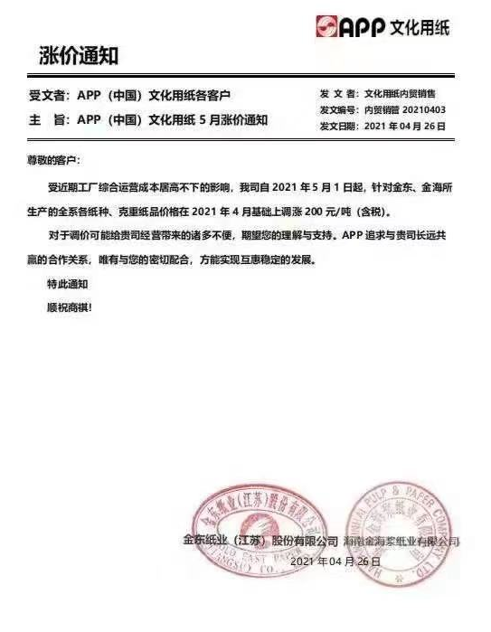 APP文化用紙:5月1日起,針對金東、金海所生產(chǎn)的各系各紙種、克重紙品價(jià)格在2021年4月基礎(chǔ)上調(diào)漲200元/噸(含稅)。