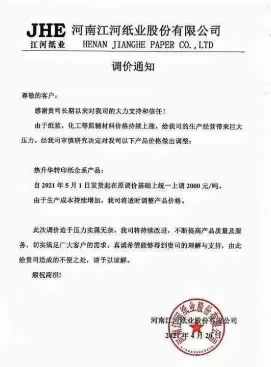 仙鶴新材料:5月1日發(fā)貨起,我司供應(yīng)的噴繪熱轉(zhuǎn)印原紙,在現(xiàn)價(jià)基礎(chǔ)上,上調(diào)2000元/噸,后續(xù)亦將視原材料價(jià)格上漲幅度繼續(xù)漲價(jià)。