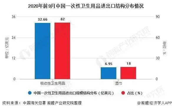 由于一次性衛(wèi)生用品種類繁多,大致分為吸收性衛(wèi)生用品和濕巾,在進出口中,吸收性衛(wèi)生用品占據(jù)主要比重,達到82%的份額。