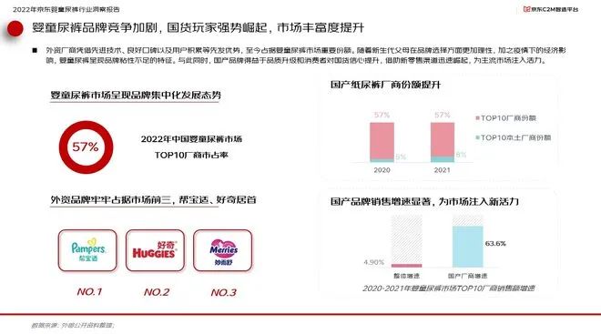 面對市場空間的變化,國內(nèi)嬰童尿褲品牌競爭加劇。其中外資廠商憑借先進技術、良好口碑以及用戶積累等先發(fā)優(yōu)勢,至今占據(jù)嬰童尿褲市場重要份額。而一方面,隨者新生代父母在品牌選擇方面更加理性,加之疫情下的經(jīng)濟影響,嬰單尿褲也呈現(xiàn)出品牌粘性不足的特征。與此同時,得益于品質(zhì)升級和消費者對國貨信心的提升,國貨品牌借助新零售渠道迅速崛起,為主流市場注入活力。報告顯示,本土頭部廠商份額從2020年的5%迅速提升至2021年的8%,而國產(chǎn)廠商銷售額年增速則達到63.6%,遠超行業(yè)整體增速的4.9%。