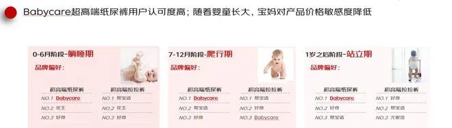 報告還對國產(chǎn)母嬰用品品牌Babycare進行了解析,發(fā)現(xiàn)該品牌的超高端紙尿褲用戶認可度高,無論是0-6個月,還是7-12個月,以及1歲之后階段,Babycare超高端紙尿褲都是用戶品牌偏好榜首。而且隨著嬰童長大,寶媽對產(chǎn)品價格敏感度降低,Babycare超高端紙尿褲成為了諸多寶媽的首選產(chǎn)品。