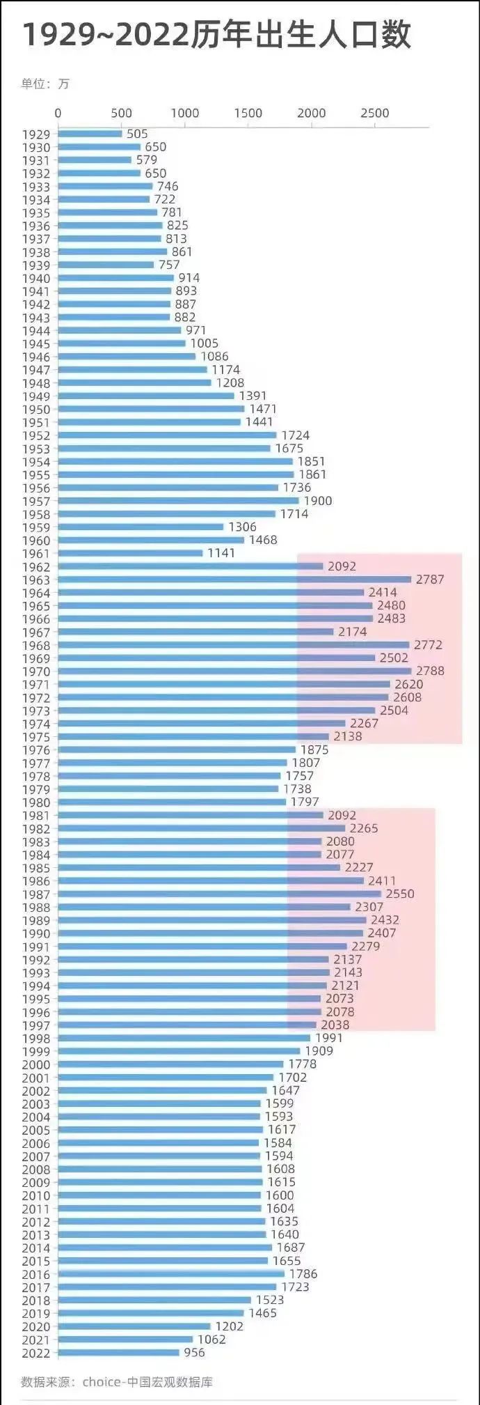 中國(guó)歷年出生人口變化(1929-2022):1970年最高2788萬(wàn),2022年全國(guó)人口出生僅為956萬(wàn),創(chuàng)下了有數(shù)據(jù)記錄以來(lái)的歷史新低。下圖是1929-2022年人口出生數(shù):