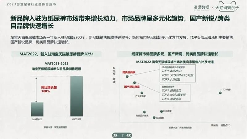 根據(jù)白皮書數(shù)據(jù)統(tǒng)計(jì),近兩年淘系紙尿褲市場新入駐品牌超300個(gè)。新品牌銷售規(guī)??焖偬嵘袌銎放瞥识嘣厔?,國產(chǎn)新銳以及跨類目品牌也在快速增長。同時(shí),bebebus、十月結(jié)晶、科巢等品牌先繼進(jìn)入紙尿褲市場,給市場帶來源源不斷的活力。