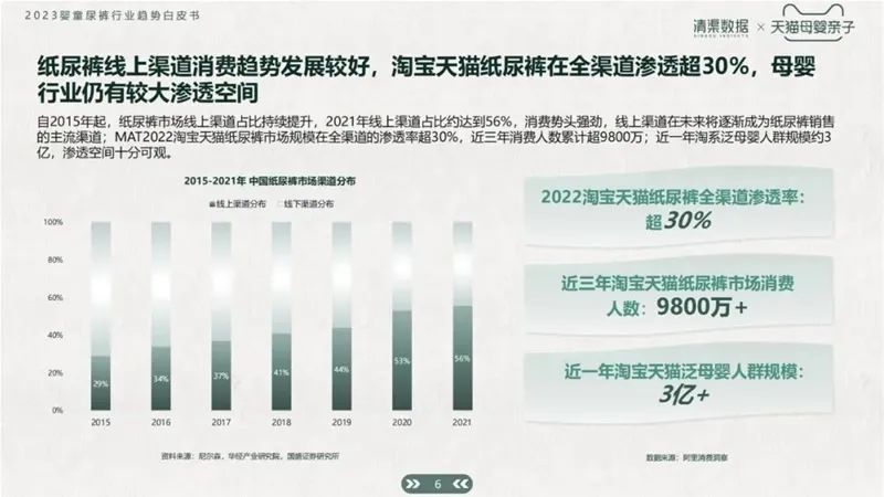 截止2021年,一半以上的紙尿褲都是由線上渠道賣出,消費(fèi)勢頭強(qiáng)勢。近三年消費(fèi)人數(shù)累計(jì)超9800萬,近一年淘系泛母嬰人群已有3億+規(guī)模。