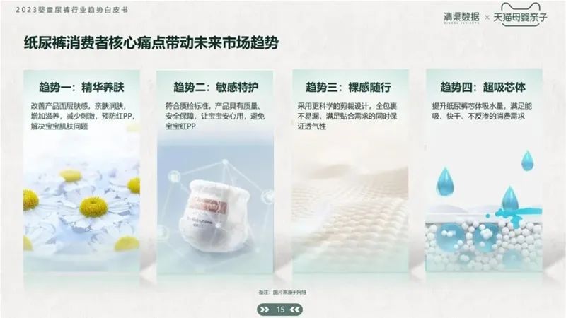 為解決6月齡內新生兒的紅屁屁問題;1歲齡左右寶寶的側漏后漏問題;以及隨著寶寶年齡增長,對紙尿褲吸水量需求變大、紙尿褲表層潮濕等問題,有超過50%的消費者表示,愿意為產品的特殊功能和成分升級支付更多費用。延伸出了精華養(yǎng)膚、敏感特護、裸感隨行、超吸芯體四大趨勢。