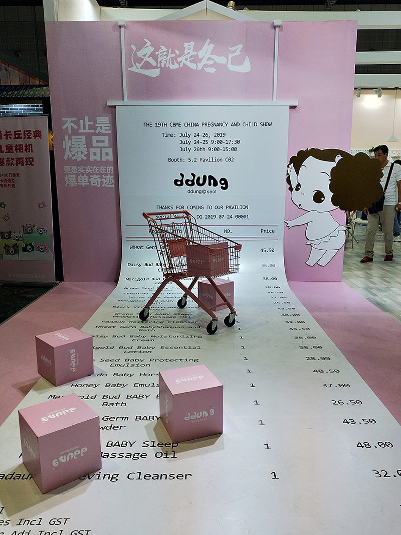 冬己展位結(jié)合卡通IP做出購(gòu)物車(chē)和賬單的場(chǎng)景,巧妙地利用場(chǎng)地空間制造立體視覺(jué),頗具想象力的設(shè)計(jì)實(shí)現(xiàn)有效地引流。